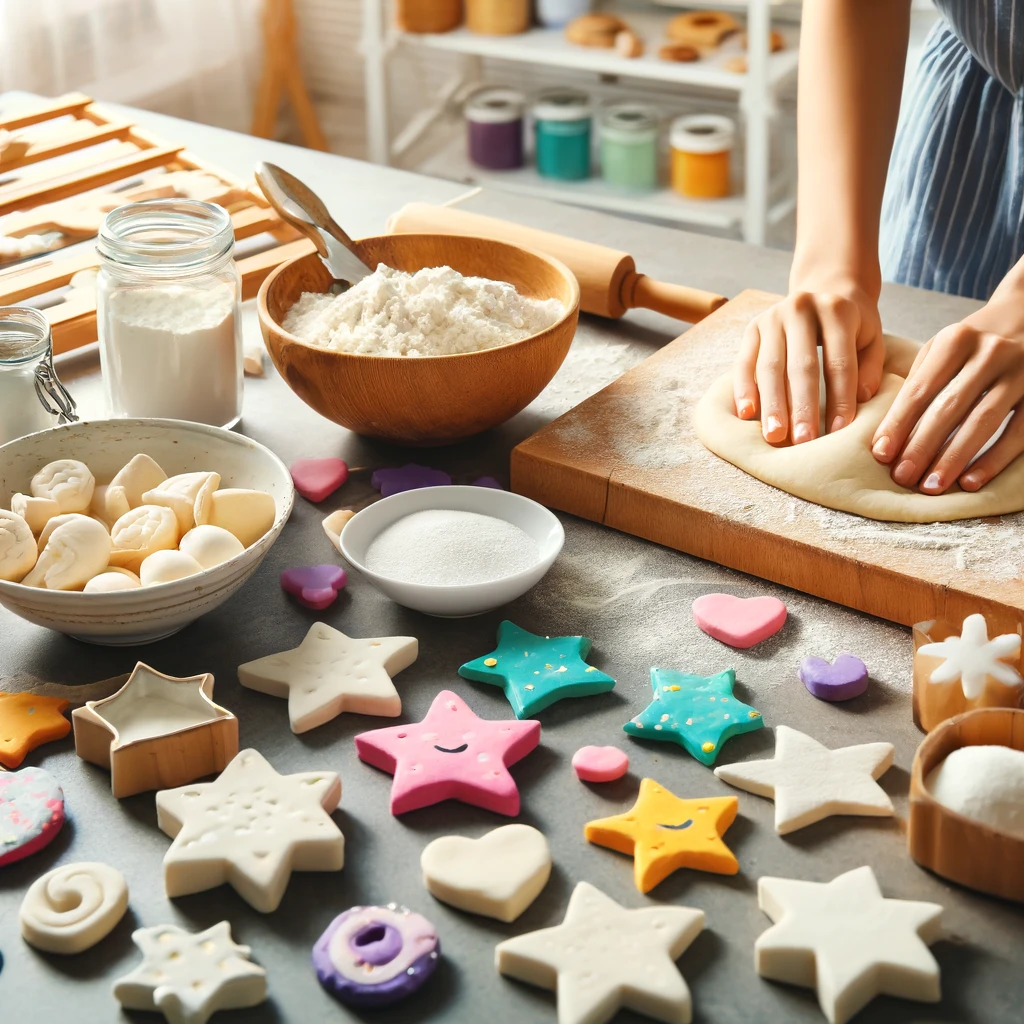 • Mischen: In einer Schüssel Mehl und Salz gründlich vermischen.Wasser hinzufügen: Langsam das Wasser hinzufügen und stetig rühren, bis der Teig beginnt, sich zu formen. Je nach Bedarf kannst du etwas mehr Wasser oder Mehl hinzufügen, bis der Teig nicht mehr klebrig ist, aber noch geschmeidig bleibt.Kneten: Den Teig für etwa 5 Minuten kräftig kneten, bis er glatt und elastisch ist.Formen: Nun kannst du den Teig nach Belieben formen. Nutze Ausstechformen oder modelliere freihand deine Kreationen.
